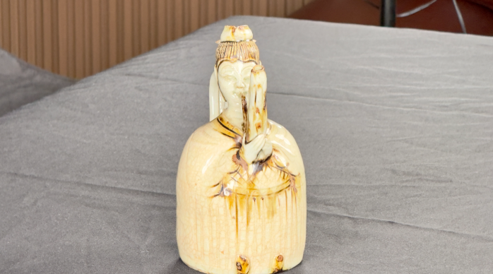 這件北宋景德鎮窯青白瓷珍品,通體施青白釉,釉色清雅瑩潤,胎質輕薄細膩。壺體被巧妙塑造成一位端坐吹笙的仙人形象,神態安詳,衣紋流暢,仿佛正奏響天籟之音。整件作品將實用功能與雕塑藝術完美結合,不僅展現了北宋高超的制瓷工藝,更生動再現了當時文人雅士崇尚清音逸韻的生活美學,是研究宋代社會文化與陶瓷藝術的珍貴實物。
